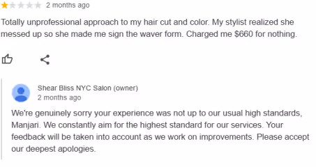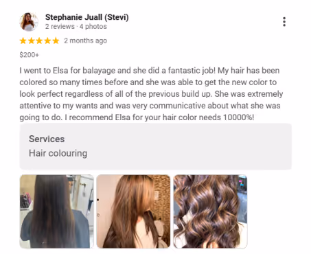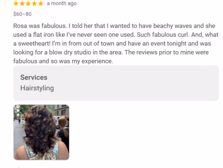 They’re powerful because you have real people vouching for you. Here’s an example of what a Google review looks like for a salon in NYC: