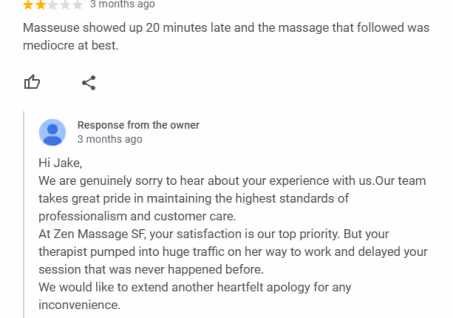 rejuvenating experience for our clients, and it sounds like we missed the mark. Please give us a call so we understand more and ensure your next visit is the relaxing experience you deserve.”