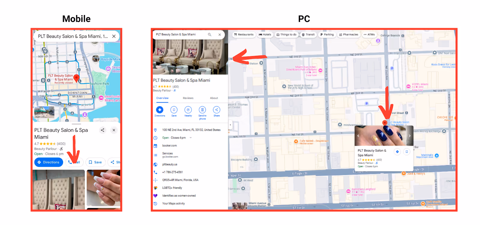 - Google Maps: On Maps, your photos are part of the decision-making process for people navigating the area. High-quality, well-tagged photos can lead to more clicks for directions, effectively turning online browsers into foot traffic. Your photos appear right on your business pin, giving users a quick snapshot of what your spa or salon looks like before they even consider stepping inside.