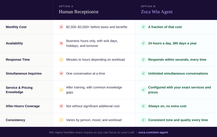 Many salons that recognise the response problem try to solve it by hiring a receptionist or front desk coordinator. For high-volume salons, that can be the right call. But it's worth being clear-eyed about what you're getting.